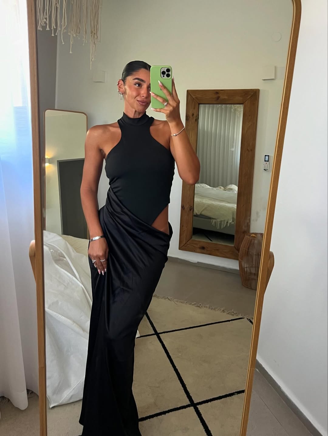 The Cynthia Maxi Dress redefines evening elegance with its bold, layered construction - an inner body-hugging bodysuit paired with a dramatic asymmetrical maxi overlay. Featuring a high neckline and sleeveless cut, this sculptural number sits off the waist for a bold, architectural silhouette. It’s a fashion-forward statement designed to sculpt your shape and turn heads from every angle.