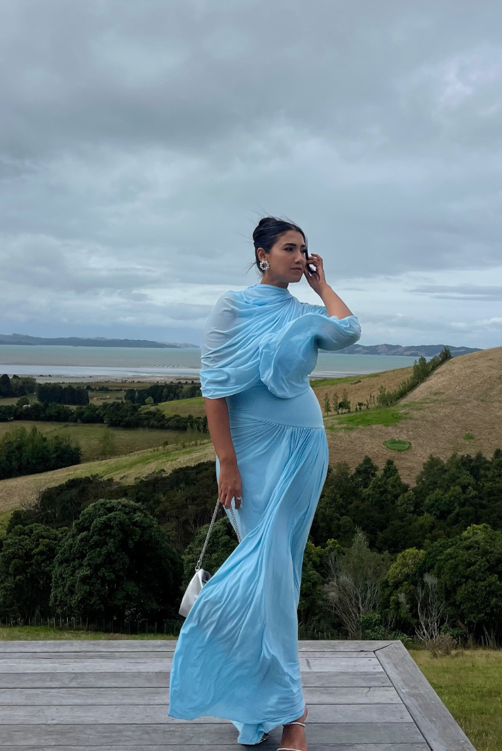 The Katie Maxi Dress is a draped beauty and your go-to for sunset soirées and elevated evenings. Designed in a soft, powder blue hue, it features fluid gathers, an asymmetrical wrap-effect bodice, and a chic one-sleeve silhouette that exudes modern goddess energy.