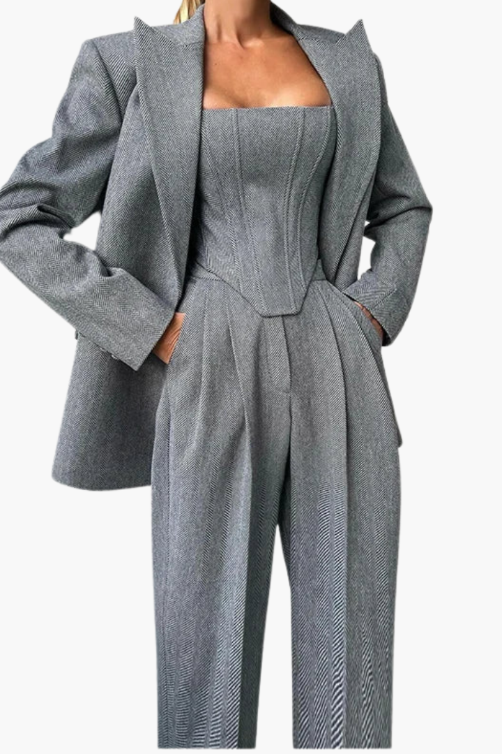 Our popular 3-piece ensemble blends structure, sophistication, and bold femininity—designed to make a lasting impression in any room. With a tailored blazer, contoured corset, and high-waisted trousers, this best-selling power set gives you endless styling potential and a silhouette that exudes strength and grace.